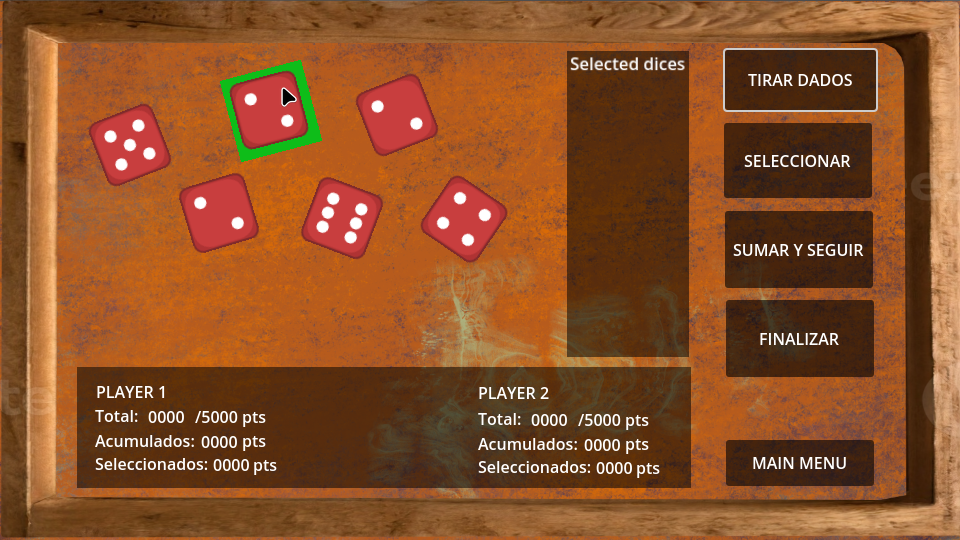 El objetivo de este juego de dos jugadores es ser el primero en alcanzar una cantidad establecida de puntos. Los jugadores lanzan por turnos seis dados. Se obtienen puntos por cada UNO o cada CINCO que se saca y por tres o más dados iguales de cualquier otro número.